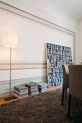 Det är alltid kul med lite fina och udda detaljer som lyfter. I den här lägenheten som är till salu hos Lagerlings har man satt in en enkel tavla med bokstäver i matrummet som matchar den överdimensionerade lampan perfekt. De små aporna (eller är det småjdävlar?) som håller varsitt ljus blir en annorlunda och spännande detalj. Man har överhuvudtaget blandat friskt - modernt, asiatiskt, retro, afrikanskt, men allt ser ut att funka fint tack vare den enkla färgskalan i vitt, brunt och svart.